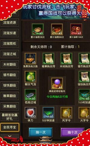 除了签到活动,在8月12号至8月15号期间,《国战天下》手游还为各位准备了“全民来寻宝”活动!参与“讨伐流寇”、“击飞玩家”、“赢得国战”均有不同概率可获一定数量的天师符,一天最多可获得10个天师符哦!