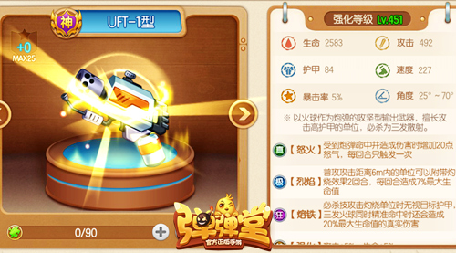 《弹弹堂手游》全新武器“UFT-1型”,是一款以火球作为炮弹的武器。其超高温的炮弹,不仅能有效的熔化对手武器的护甲,还能产生灼烧效果伤害敌人。新武器擅长攻击高护甲和高血量的单位,并且必杀为三发炮弹散射,全部命中时能打出恐怖的伤害,是不折不扣的高护甲克星。