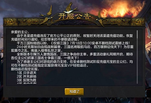 与很多只追求流水和利润的游戏厂商不同,《权倾三国》从一开始就非常注重玩家的公平体验,游戏内任何性质的折扣和返利都是被官方明令禁止的;一旦出现违规,无论是任何一家合作商,都会立刻中止合作,关停所有充值来保证100%的公平;