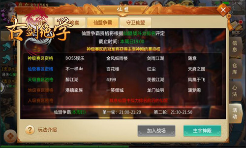 如果说普通玩家间的战斗是热血PK,那么每周限时开启的仙盟争霸玩法则是神仙打架!在冰河游戏《古剑绝学》中,玩家可在每周日晚21:00,带上仙盟当中的其他小伙伴共同征战仙界,与其他仙盟展开一场百无禁忌的群殴大战。仙盟争霸玩法中胜出的玩家不仅可领取海量奖励,更有机会夺得主宰神殿统治权哦!