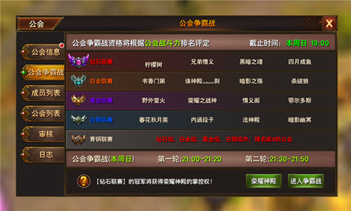 公会争霸战按照公会战斗力排名一共分为青铜、白银、黄金、白金、钻石五大不同等级的联赛,每周日的晚上,所有公会将会集结到一起火拼,争夺联赛第一名的资格。钻石联赛的冠军还能够进入荣耀神殿,夺取其控制权!