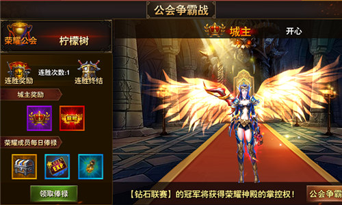 获得钻石联赛的冠军能够进入荣誉神殿,其中,公会会长将会成为荣耀之城的城主,获得荣耀王冠以及“君临天下”的专属称号,能够大大增强战力!除此以外,公会成员每日都能够获得俸禄,内有图腾宝箱、经验以及提高掉率的幸运药水!