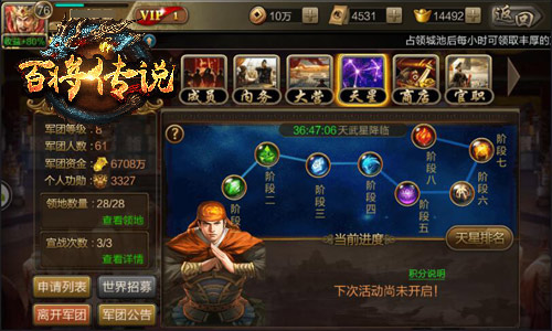 天星榜并非玩家一人能够挑战,诸位玩家别忘记叫上自己的朋友共同冲刺天星榜哦!在冰河游戏《百将传说》中,玩家与军团中的其他小伙伴每人消耗1000粮草,即可增加军团1点天星榜积分。当进度达标后即可进入下一阶段并获取奖励。玩家可在天星榜开启期间扫荡城池、参与城战,快速消耗粮草来增加天星积分哦!