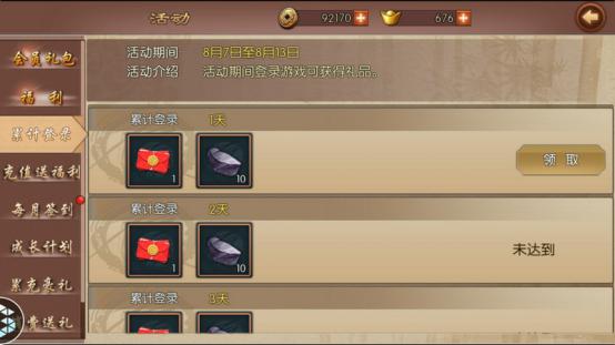 活动期间,每天累计登录游戏就有红包拿!红包能够开出数量不等的侠客令或者元宝,就看你的运气怎么样了!玩家通过游戏主界面的“活动”入口,即可查看立秋七天乐的全部福利活动详情并领取奖励!