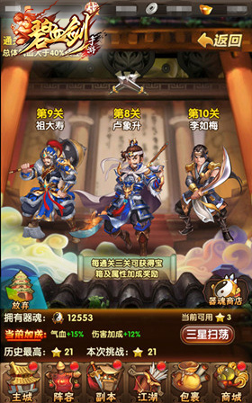 《碧血剑》凌虚阁玩法类似爬梯玩法,由玩家进入其中进行闯关并获取奖励!每天可以免费闯关一次,每通关三关可以获得宝箱及属性加成,产出器魂、元宝和英雄碎片等丰厚奖励。需要注意的是凌虚阁的器魂商店,是玩家获取蓝装、紫装和橙装最重要的来源。利用闯阁获得的器魂进行强力装备兑换,迅速提升实力,这也正是凌虚阁给予玩家最大的福利!