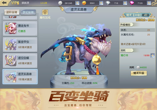 而对于那些霸气外露的高玩来说,高阶坐骑的各种上古魔兽显然更能衬托他们的卓然不凡。目前游戏开放了“紫金甲虫”、“虚空血蝠”和“虚灵玄晶兽”三种魔兽类坐骑,其中的紫金甲虫骑术达到5阶就能解锁。魔兽类坐骑普遍身材巨大,坐上去颇有种“一览众山小”的感觉,感觉整个人都变得酷酷哒,你也快来试试吧!