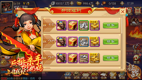 除以上大型活动或玩法奖励的元宝外,《三国战纪群雄逐鹿》中还有许多小玩法送元宝哦!比如新手教学任务、首日登陆奖励、每日连击奖励、摇一摇奖励等……总奖励可达到1600元宝。