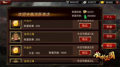 试炼每完成一节后,还需要升金丹才能继续突破,升金丹可以在联盟的活跃商店里购买。此外还有一个道具是金将之魂,这个道具是你进阶到下一个境界时需要的,当你达到飞跃六节的时候会需要金将之魂来进阶下一个境界。金将之魂同样跟升金丹只能在联盟活跃商店购买。