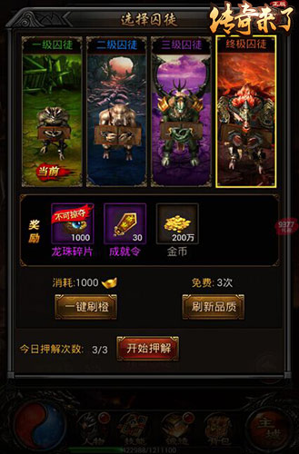 可以看到,在9377《传奇来了》的“押解囚徒”玩法当中,勇士强者们押解的囚徒品质越高,完成之后能够获得的奖励就越丰厚。而囚徒品质,可以通过刷新来进行提升。其中每天可以获得3次免费刷新的机会,随后每次都要消耗一定的元宝,而勇士们也可以一次性消耗1000元宝直接刷出橙色品质的囚徒。