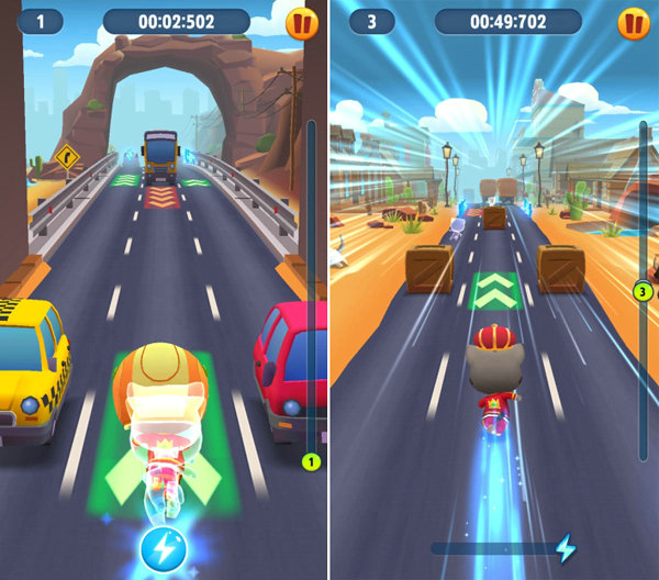 即将开启的新课程让你鸭梨山大?没关系,先在《汤姆猫跑酷》的新“挑战”中锻炼一下自己吧!游戏周年庆版特推“多人模式”玩法,小伙伴们可以和其他玩家同场竞技,利用地面的绿色和红色箭头图形加速,并收集闪电道具触发疾跑状态。与单人模式不同,多人模式采用排名制,率先冲过终点即为胜者。紧张刺激的跑酷越障比赛,前所未有的视听操作体验,玩过之后你必然会发出这样的感慨:神马新课程都是浮云!