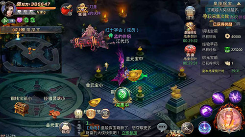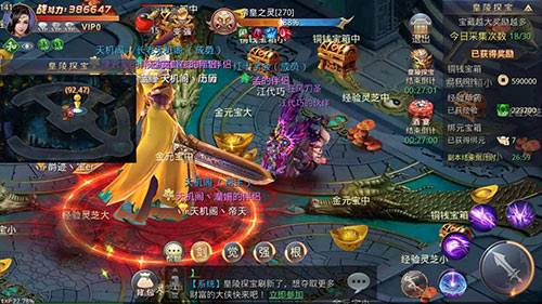 进入皇陵后,金光闪闪,让小编的眼前一亮,内心止不住的激动。遍地金元宝,铜钱宝箱和经验灵芝,是的,你没听错,是遍地!皇陵内的三种采集物每一样都有,大,中,小之分。就是字面上的意思,大宝箱当然东西更多,每个道友可采集30次宝藏,至于需要采集金元宝还是经验值,道友们可以自由安排好这三十次的机会。
