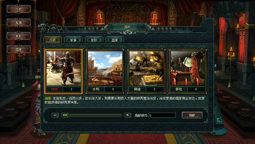 《卧龙吟》国政系统中的这个功能是给各位玩家们捐银子的,上面有4个捐款项目:治安、水利、铸造、祭祀,分别对应封赏时银币、粮食、金币、将魂。玩家们捐10W银币可以换取1点政绩,但是在丞相发布相应的内政令后,相应的捐款项就变成了10W银币换2点政绩,这个时候,大家就要抓住这个好机会了,千万不要错过啊!另外在国政系统中还有官职的功能,每天会有相应的俸禄,要知道,这个俸禄是实打实的金币哦!