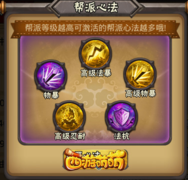 《西游萌萌》帮派玩法让玩家在找到了组织的同时也是大家提升实力的重要途径。尤其是“帮派心法”系统更是有着“一套心法,全员收益”的美誉。一套强力的帮派心法将会让帮派全体成员战斗力大踏步前进,为未来的帮派取得“帮派战”的胜利打下坚实的基础。