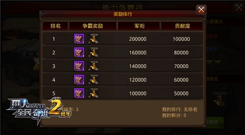 既然是《全民奇迹MU》5.0新版本的重头戏之一,势力争霸战的福利奖励自然也是非同寻常。在每场势力战之后,根据战场积分会有个人排行榜,而排行榜的名次,则决定了玩家们的基础奖励额度,奖励内容包括但不限于金币、军衔、道具宝箱、势力贡献度等。值得一提的是,占领不同的城池之后,占领势力之中还会出现相应的专属商城,供三大势力玩家们兑换相应的资源道具。