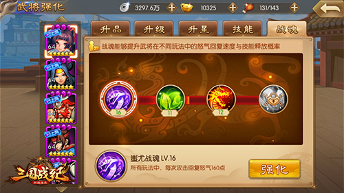 武将达到紫色品质后开放战魂。每个武将都拥有四种战魂,且随着武将品质的提升依次开放。战魂的升级需要一定的升级材料和银两。在材料和银两不充足的情况下,要注意各种战魂之间的取舍。