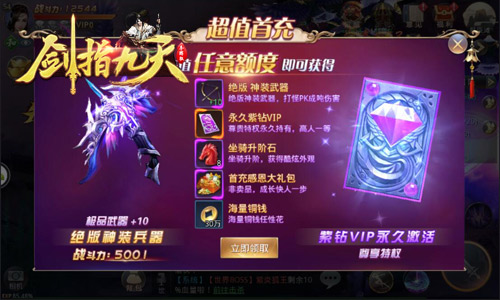 乱世英豪,非你莫属!冰河游戏2.5D-ARPG正统武侠手游《剑指九天》首服开启后,玩家首冲0.1元即可兑换永久紫钻vip、绝版神装武器、感恩大礼包等五重豪礼,七日登录更送圣武激活卡、绝版称号等多重大礼,为各位玩家的江湖之路助力!此外,首服开启后还有升阶暴击、每日累充、投资理财、四倍返利等多重福利在等着你!