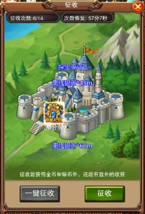 当然,作为领主的你也要体恤民情,不能横施暴政。征收适量资源即可。系统为此也特意设定了一小时才能恢复一次征收次数。除了能获得最基础的金币和银币之外,偶尔还会有意外收获哦,如何意外?这就得你自己去游戏中体验了。