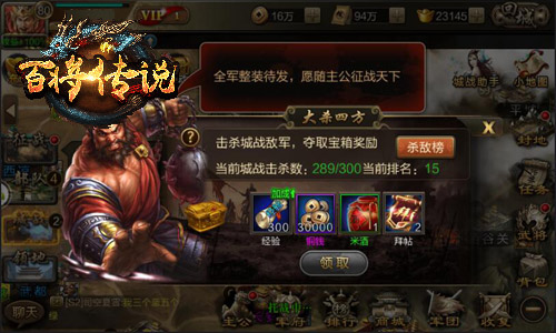 城战相逢勇者胜,谁杀敌多谁牛X!在冰河游戏《百将传说》中,玩家每日城战杀敌数达到特殊数量后,系统将为玩家送上每日城战杀敌宝箱奖励,100%获取海量经验、铜钱、米酒、拜贴等道具。每天夜间,系统还将根据玩家当日杀敌排行榜排名送上海量铜钱、功勋与令箭奖励,各位玩家千万别忘记参与城战,冲击杀敌排行榜哦!
