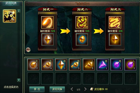 武石镶嵌槽分别为“天”“地”“人”三个类别,对应三级连动招式。玩家可通过武石精华提升武石等级,进而增加连招攻击力。连招有一定的触发概率,要想打出一套漂亮完整的连招,需不断提升武石等级。