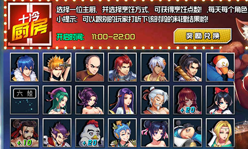 十冷厨房,可以在21位角色中任意选择来调配料理,这可不是黑暗料理,玩家通过煎炒烹炸等烹饪方法获得互动积分去兑换角色精魄碎片,每天每种料理方式所获取的积分各不相同,在烹饪之前不要忘了问前辈哪种烹饪方式获得最大的积分呦。