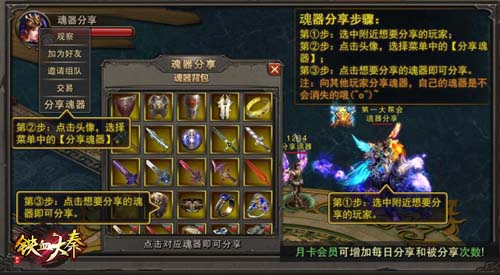 要说《铁血大秦》的游戏特色,经典必然是不能绕过的,但要说最时髦的,自然是装备共享功能,远在共享单车之前,铁血大秦的开发时,就已经增加了装备共享功能,并在最新的版本推出。在游戏中可被分享的装备是魂器,拥有独特而强大的属性,每个玩家做多可装备8个魂器,而魂器可以通过猎魂、魂器召唤石、玩家分享获得,而分享的魂器和玩家拥有的完全一模一样。