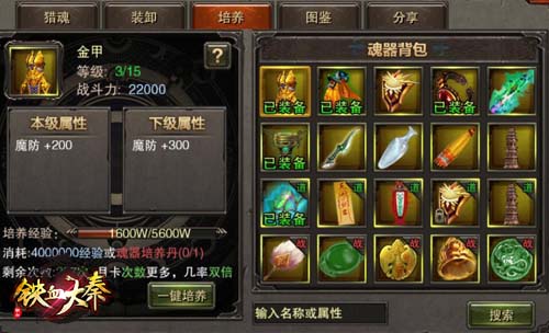 成长起来的魂器属性惊人,那培养魂器会不会很难?自然不难,十二宫副本必出魂器培养丹,觉得魂器培养丹不够用的还可以消耗400W经验/次培养,完全可以说是全民都可以轻松培养出高级别的魂器了。不过如果想培养出8个高级别魂器,还是要费一番功夫的,不过如果有三两好友一起玩,各自培养三两个魂器,再各自分享,轻松装备好八个魂器岂不美滋滋!