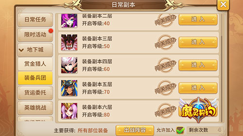 《魔灵契约》的另一个日常副本就是装备兵团啦。装备可以为英雄增加属性,使英雄实力更强大。而装备兵团送出的便是随机部位的装备!不过同样的,装备兵团也有等级限制,玩家需先达到相应等级方可开始活动。记住,越是高级的副本,玩家可获得的奖励就会越好哦!
