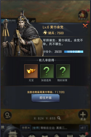 东汉末年,黄巾起义,军阀混战,生灵涂炭,民不聊生。而后,张角病死,黄巾落败,四处流走,打家劫舍,掠夺土地。一身正义的各位主公们,为救身陷水深火热中的黎明百姓,愤起与之较衡!黄巾余党每天在大地图上都会随机出现,攻打黄巾余党可以获得额外丰厚的奖励,每个等级的黄巾,第一次攻打的时候都可以获得元宝奖励。资源带不同,黄巾余党的等级也不一样,挑战更高等级的黄巾,奖励会更加丰厚!