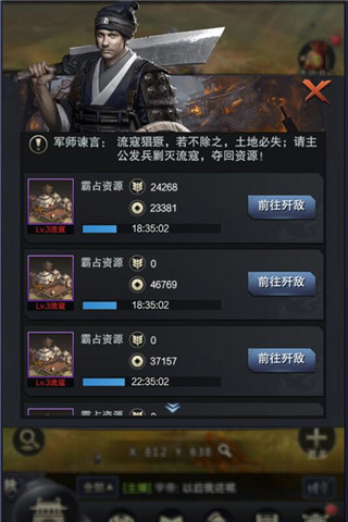 除此之外,乱世年代,到处不太平,流寇土匪时常出现,祸害平民。当主公占领的土地超过4块的时候,每天9点,13点,17点,流寇就会出现在主公所占据的土地上,流寇出现后,会各自占据土地,被流寇占据的土地的收益会被流寇掠夺,不再为主公所得,若在流寇驻扎的时间内,主公不派兵歼灭流寇,则将损失流寇占据的土地及期间掠夺累计的土地收益。而歼灭流寇,便能收缴他们停留期间的掠劫所得,并且还有额外的奖励,如令旗或战鼓。