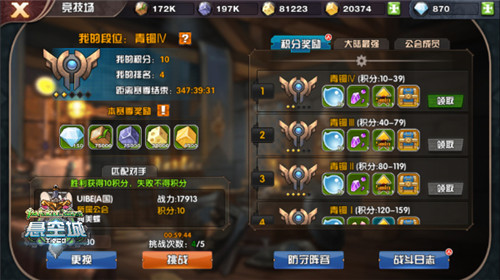 目前游戏内竞技场分为青铜、白银、黄金、铂金、钻石、超凡大师、最强王者七个段位,同时每个段位又分为5个小段位,在悬空城大陆中积分排名前10的玩家可以成为最强王者,想想都有点小激动有木有!成为最强王者不仅可以获得丰富的奖励,关键是接受众多美眉的膜拜,不说了,小编都想去闯荡一番了!