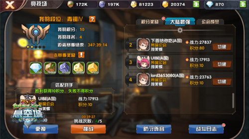 值得注意的是在竞技场中玩家将与4个国家的所有勇士进行匹配挑战,当主动挑战胜利后则可获得积分,防守失败扣除积分,同时也有次数限制,但是不论成功失败,都会获得丰富的奖励呦!