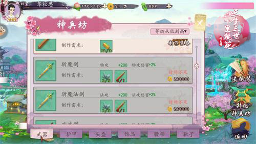 在《三生三世十里桃花-桃花醉》中,装备不仅可以改变角色的形象,还是一个提升战斗力的利器。通过消耗材料来制造所需要的装备,此外修行神兵坊可以获得更高级装备的配方哦,祝你战斗力爆棚。