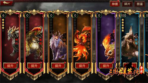 在新版《三国群英传-争霸》中,神兽玩法主要包含“召唤”、“兽林”、“驯兽术”、“神兽图鉴”,以及“神兽商店”和“排行榜”这几个功能,其中“兽林”主要是用于存放主公拥有的神兽以及神兽碎片,神兽碎片主要通过高级召唤以及神兽商店获取,达到一定的神兽碎片数量可以兑换相应的神兽,神兽按照红、橙、紫、蓝等不同颜色来表示品质稀有度。
