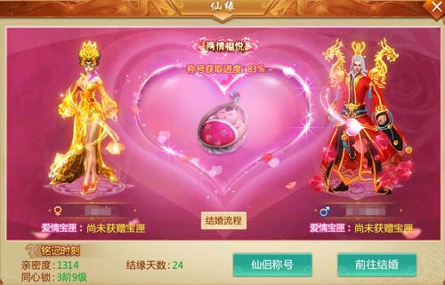 成功结为道侣的玩家,会收到象征爱情坚贞的同心锁装备,获得爱的属性加成。同心锁不是一成不变的,随着爱情的纯粹升华,越来越甜蜜的道侣携手闯过情缘副本,历经妖魔鬼怪的冲击,获取三生石提升同心锁的等级,随着经验的增加同心锁越来越华美,给道侣们提供更强劲的属性加成。(离婚后无法享受同心锁加成哦!)