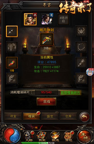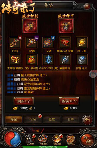 1.寻宝,消耗元宝寻宝有概率获得各种橙色品质装备;