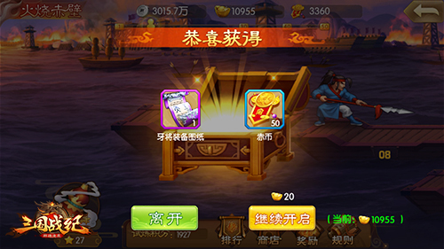 在火烧赤壁中,玩家们还可以发现很多宝箱,其中包含大量赤币、坐骑经验丹和纹银等奖励,而且,还有一定几率获得完整武将——不是武将碎片哦!另外,开启宝箱后还会遇到隐藏宝箱,花费少量元宝即可开启,奖励绝对超值!