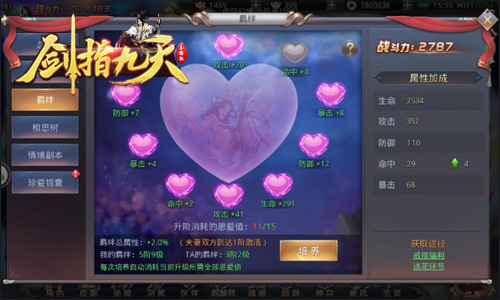 爱情,不光是你侬我侬,也可能是吵吵闹闹哦!在冰河《剑指九天》中,已经结婚的两名玩家将自动开启爱情羁绊玩法,玩家通过情缘副本、真爱锦囊等玩法获取恩爱值后,即可升级爱情羁绊。玩家之间的爱情羁绊等级越高,两人增加的属性也越多,最高可同时增加生命、攻击、防御、命中、暴击五种属性哦!