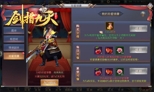 手段再高不如发个红包,嘘寒问暖不如打比巨款。在冰河《剑指九天》中,如果各位玩家真的喜欢自己的另一半,不如为TA购买一份真爱锦囊。获取锦囊的一方当日即可获取1314绑定元宝奖励,之后每日还可获得海量爱情果实、相思豆、累计多日登录后赠送锦囊的一方同样可以获取多重道具奖励,让自己的爱情更有价值!