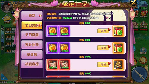 节日兑换活动,道友们在这里每日可以直接兑换到平时难获得的各类神器资质丹,各类变身卡碎片,让升级手中神器,凝聚变身卡轻轻松松。使用在活动中获得的变身卡,只需点击附近玩家找到邮件一行的变身按钮可以让对方变身,对其他玩家变身后双方都可以获得大量经验,变身的形象随机获得,真的是十分逗趣的活动