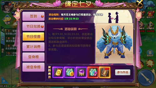 七夕与道侣一起刷一刷节日BOOS也是一件十分惬意的事,每天的9.30、14.30、20.30蓝狐会出现在紫霄城,参与击败蓝狐活动都可以获得丰富的奖励,有大量绑定元宝、进阶礼盒、元神丹、等等宝物,让小编瞠目结舌,口水直流!