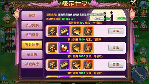 七夕节怎么能不为另一半置办礼物呢,为了鼓励各位道友《紫青双剑》推出累计消费活动。在活动期间花费600元宝就可以获得8个变身碎片,15个神器洗炼锁,35个英雄技能书,2个变身卡,消费的元宝越多获得的奖励就越多!