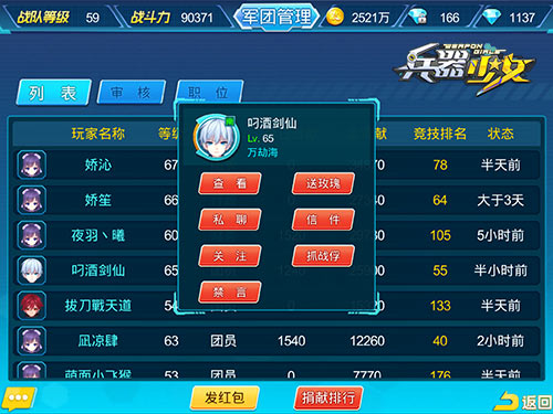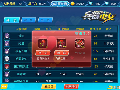在《兵器少女》中,咱们选用的自然也是最直白的表达方式——送你一朵小花花!《兵器少女》中的队长们每天可以对除自己外的任何人,免费送一次玫瑰花花,而且这个赠送是不限阵营、等级、军团的,对于想上演“罗密欧与朱丽叶”或者“断X山”的队长,这个是个不可多得的秀恩爱好机会。