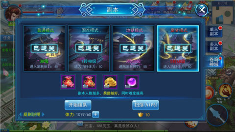 当然,若是玩家老爷想以最快的时间获得更多奖励,只要VIP5或以上的道友便可花费10元宝一键扫荡轻松获取资源。但扫荡只能获得相当于单人进入副本的奖励,可没有三人组队来的那么丰富哟!