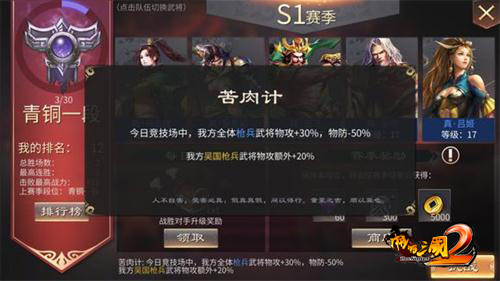 此外在竞技场环节中,玩家每天还会得到一个随机的战斗BUFF,玩家可以根据主将的优势技能再搭配战斗BUFF,相信有出其不意的效果哦。竞技场每日会根据玩家的战斗表现发放奖励,奖励丰厚程度将取决于玩家当前段位以及当日获得的星星数量。