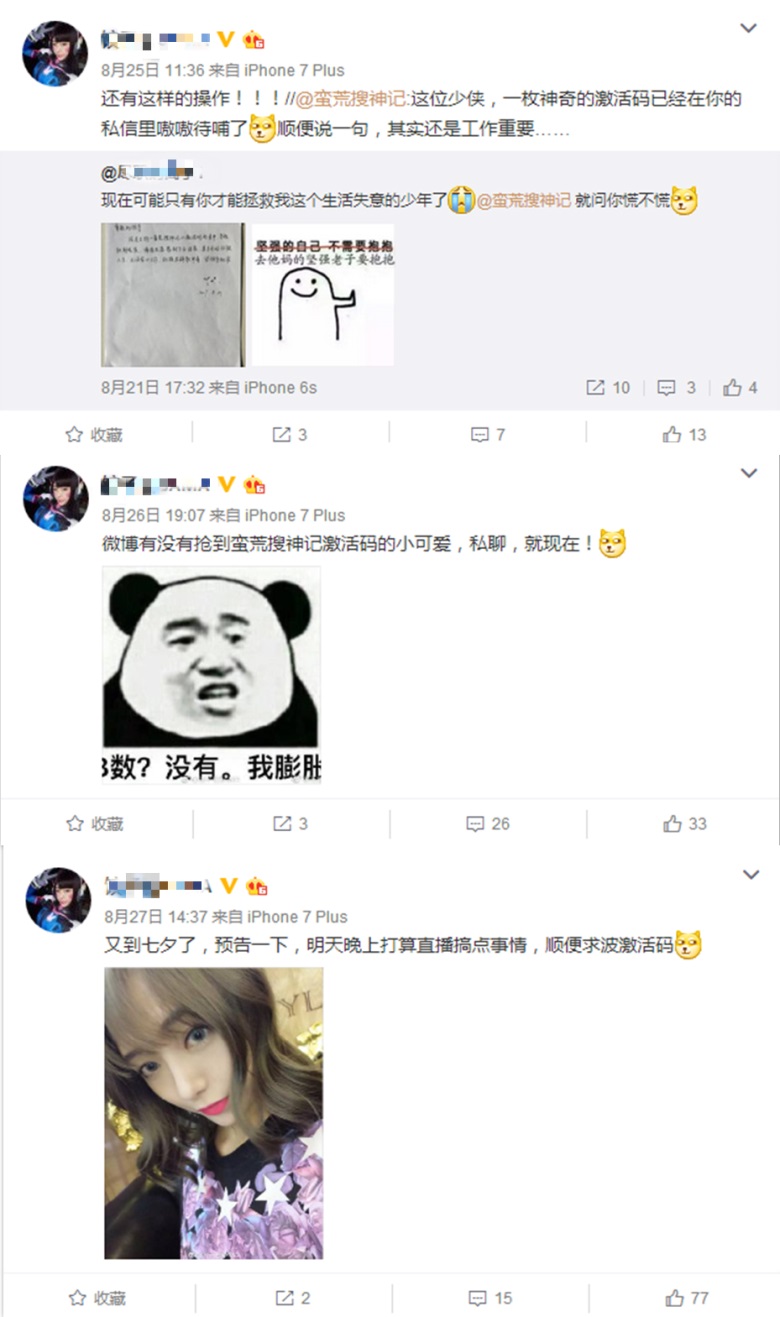 果然还是面基的诱惑更大,主播的死忠粉们纷纷发动自己的各路资源,寻找激活码的踪迹,在短短不到1个小时的时间里,便先后有数十位粉丝声称自己已经拿到了蛮荒搜神记的激活码,要求面基!而主播小姐姐在收到了游戏激活码后,也兑现了自己的承诺与第一个送给自己激活码的粉丝来了场亲密的同城约会。
