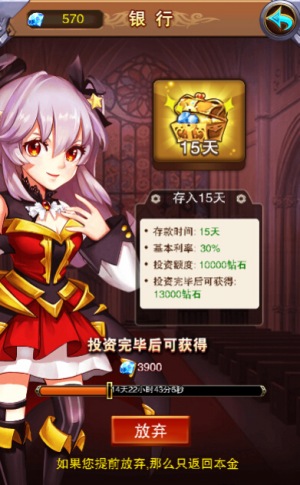 银行的营业员是一个萌萌哒的妹子,别盯着她流口水了,还是专注下投资金额和期限以及利率吧。钻石存取分为三种,其一:3天期限短期,利率只有3%,最多可存3000;其二:7天中期存款,利率10%,最多可存5000钻石;其三:15天长期存款,利率高达30%,完爆余额宝,最多投资10000钻石。