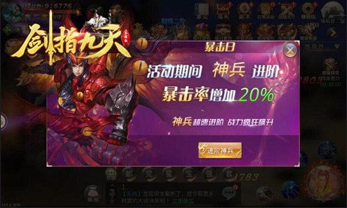 开学了,还没把坐骑晋级到满阶怎么办?莫慌莫慌,冰河《剑指九天》开学季暴击日帮你忙!游戏中,系统将随机开启一种特殊进阶日,玩家进阶系统指定的各类系统即可获得20%进阶暴击率,进阶效率直升20%,轻松打造各类满阶系统!暴击日开启后,系统还将为玩家送上海量升阶返利,助各位玩家既省钱又快速的进阶哦!