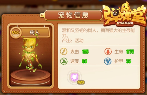 喜欢攀爬打滚,双手可以像生长的树枝一般自由伸长,唯一会说的话是“我叫格鲁特”,特别玩《弹弹堂手游》,并且弹射技巧十分出众,每次赢了都会露出能让人萌化的可爱笑脸。树人格鲁特是银河护卫队的一员,如今,小小的它加入了《弹弹堂手游》宠物大家庭,成为紫宠守护你!