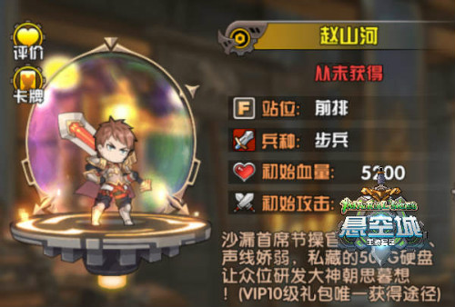 在《悬空城》的永恒品质英雄中,有四位金色英雄比较特殊,他们不能通过召唤和英雄宝箱来获取。这四人就是大名鼎鼎的游戏主角赵山河、王雪花、黑市商人和公会会长,由于自带出色的属性、逆天的战力和无解的技能,使得他们在游戏内非常抢手,目前获得这四位主角英雄的唯一方式是通过VIP礼包获取,喜欢的指挥官千万不要错过呦!