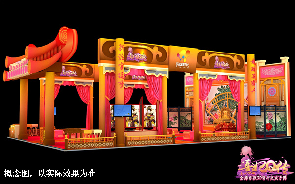 本次《熹妃Q传》的展台以游戏中3D场景为设计模板,选用了辉煌醒目的亮金色和明艳大气的红色为主色,还原了以古代基础元素为重的开放式宫廷景观,以更具冲击力、更为迎合游戏呈现的视觉效果吸引玩家关注,在原有的复古格局之外,使人油然而生庄重之感。
